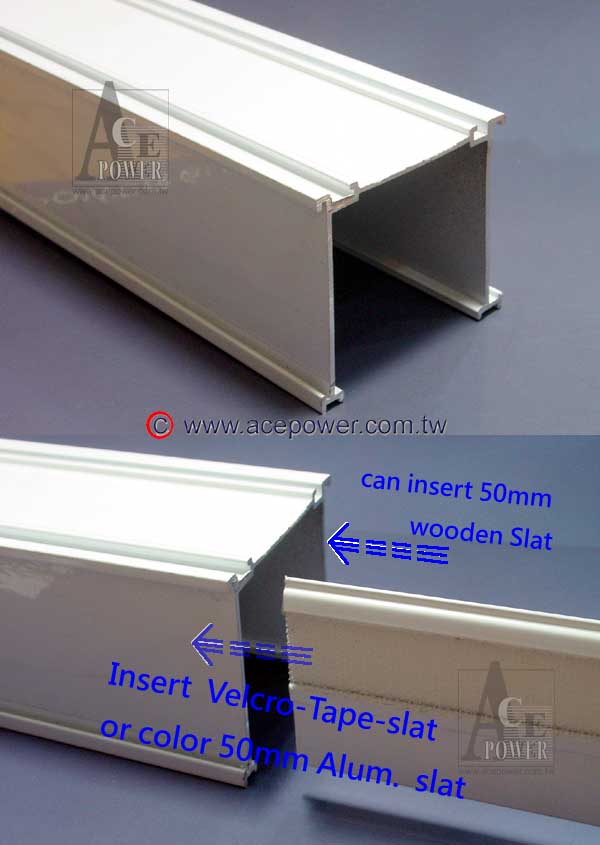Alum. Head rail 50mm x 50mm, PAINTED, White , Could Insert 50mm Velcro-Tape-Slat (M50-18B) , or 50mm Venetian Alum. Slatt, The other side Could Insert 50mm Wooden Slat. |